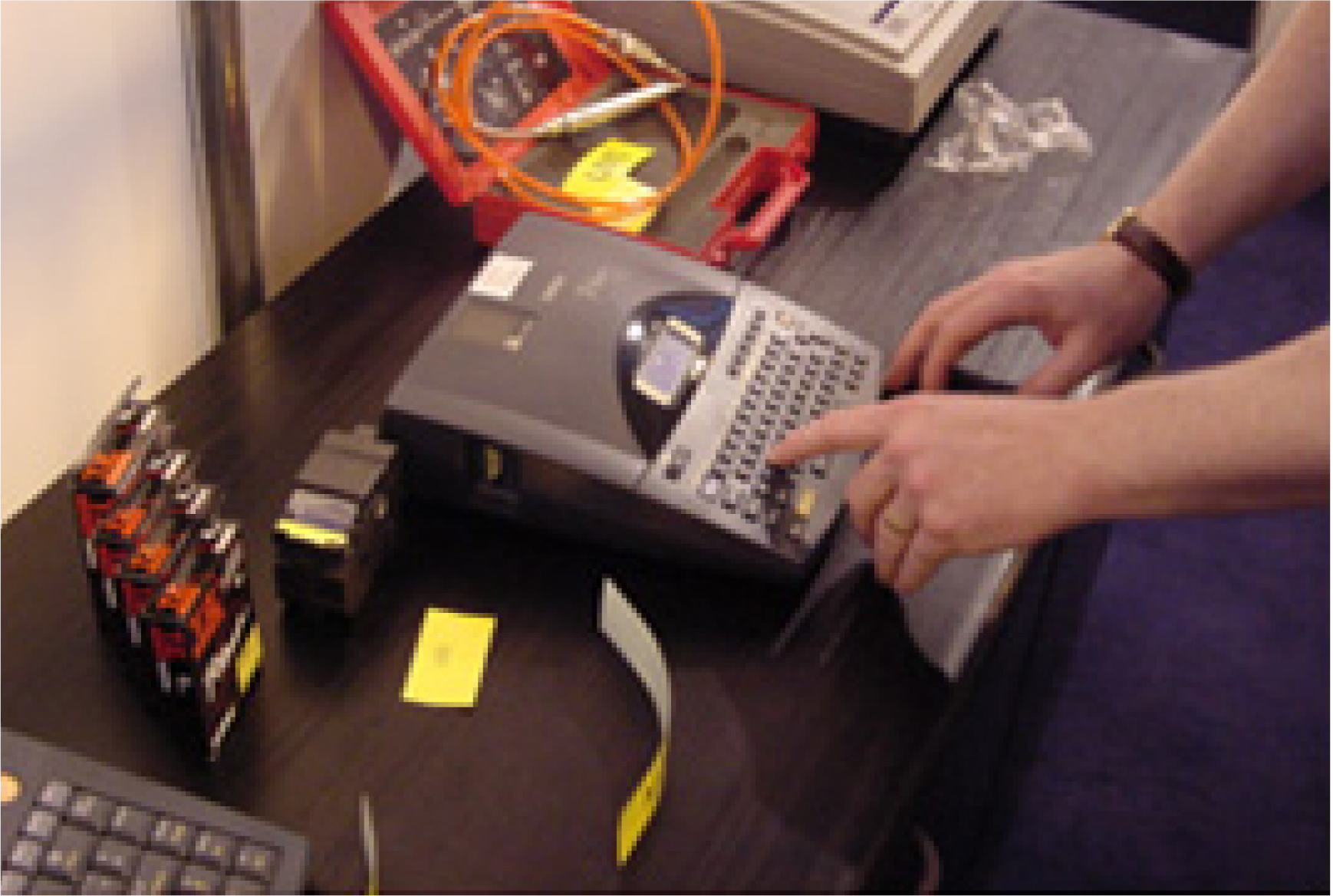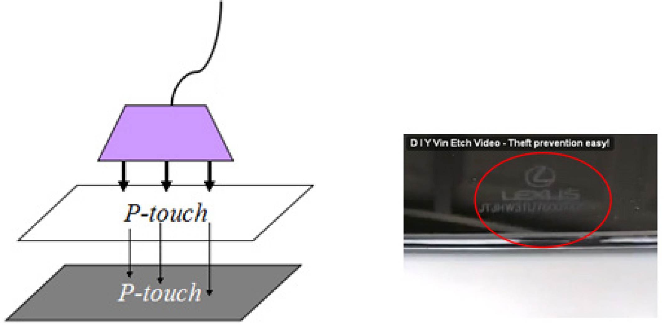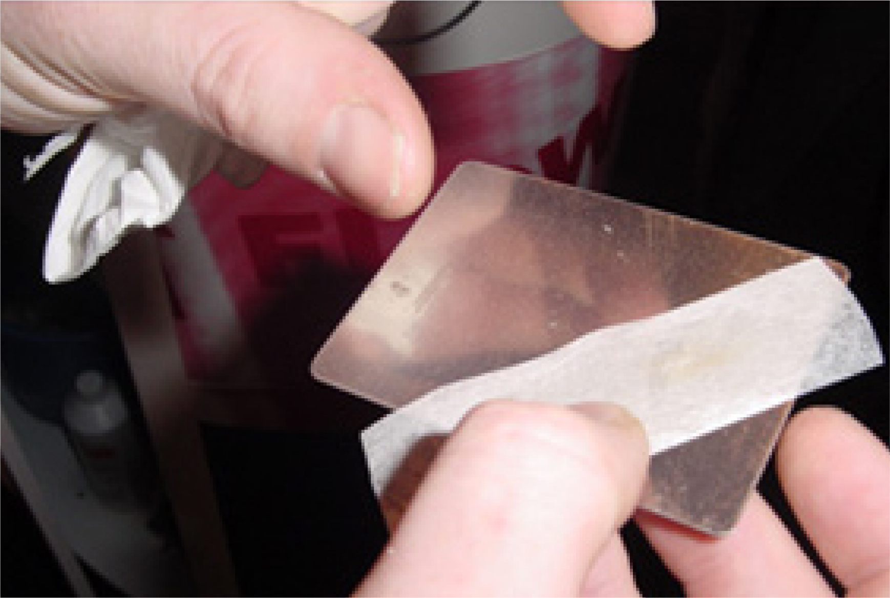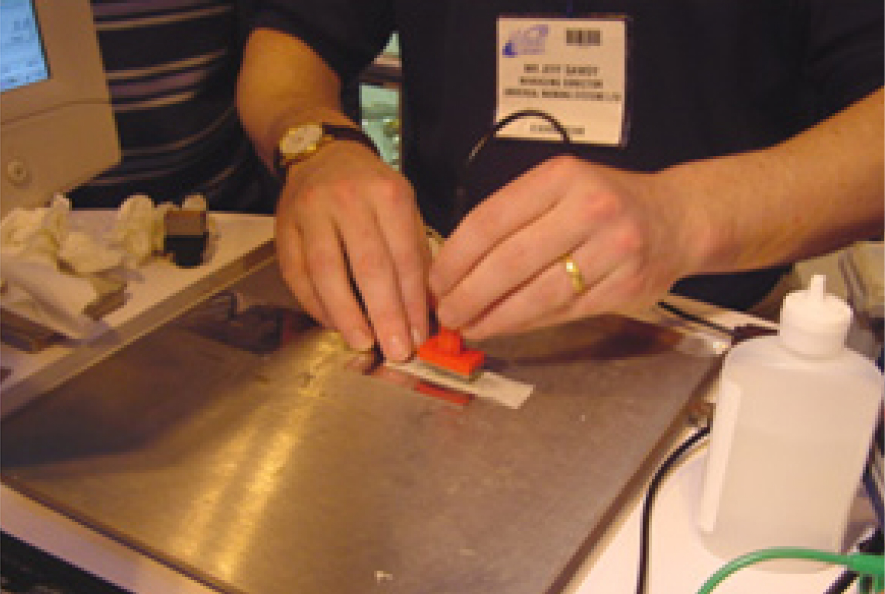 step3: 使用電解液設(shè)備將蠟紙漏印標(biāo)簽上的信息腐蝕在金屬上。(整個(gè)制作過(guò)程迅速、干凈,蠟紙漏印標(biāo)簽可被反復(fù)使用將近50次)